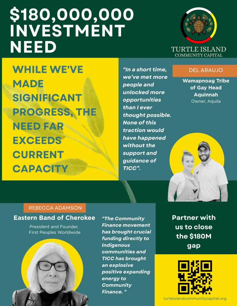 These numbers tell a story of early momentum, but they point to something larger. Our region holds a documented (so far) $180 million investment need across Native businesses, cultural institutions, food sovereignty projects, and clean energy infrastructure.